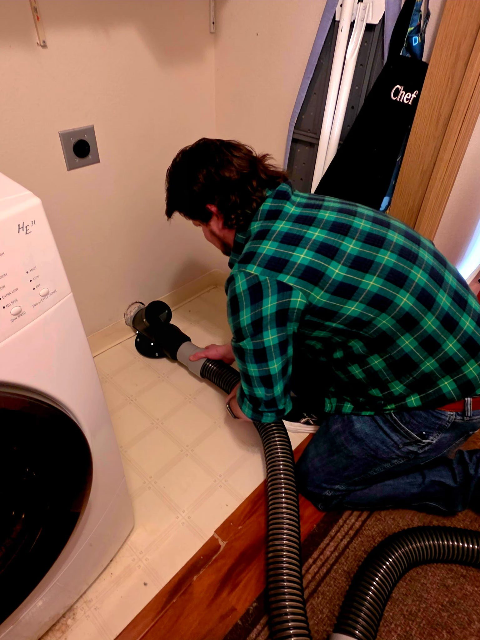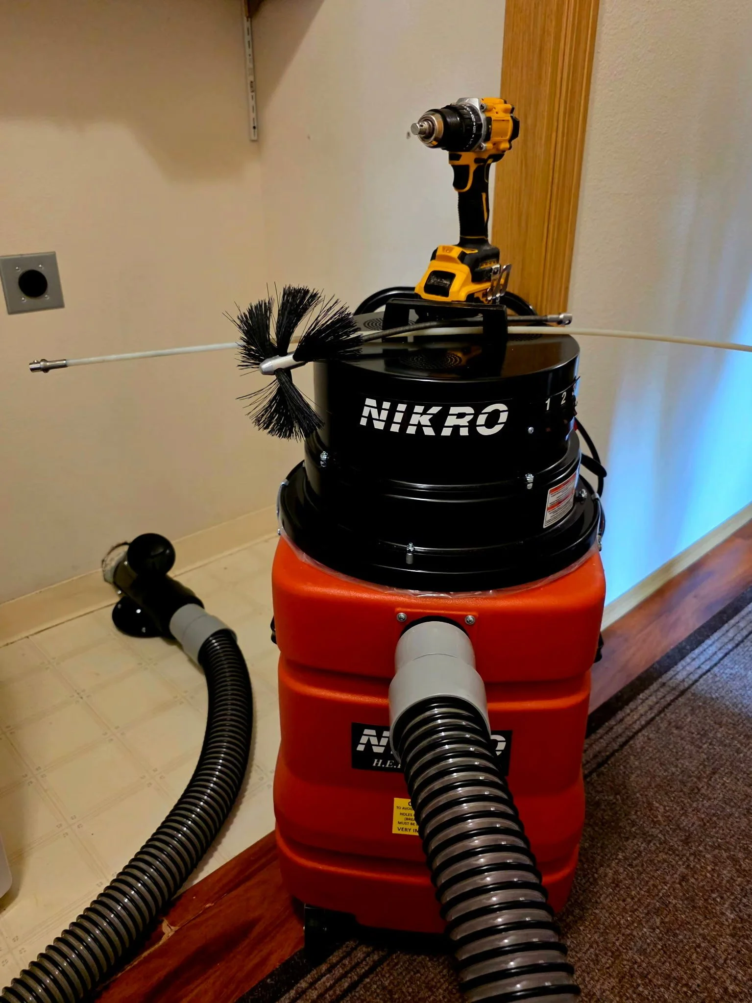 We use a commercial-grade Nikro vacuum system with HEPA filtration to capture and remove lint — not just move it around